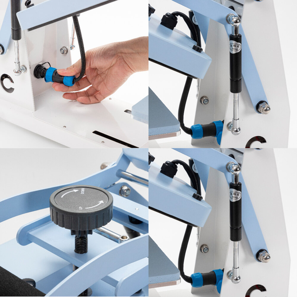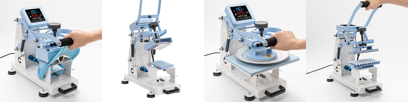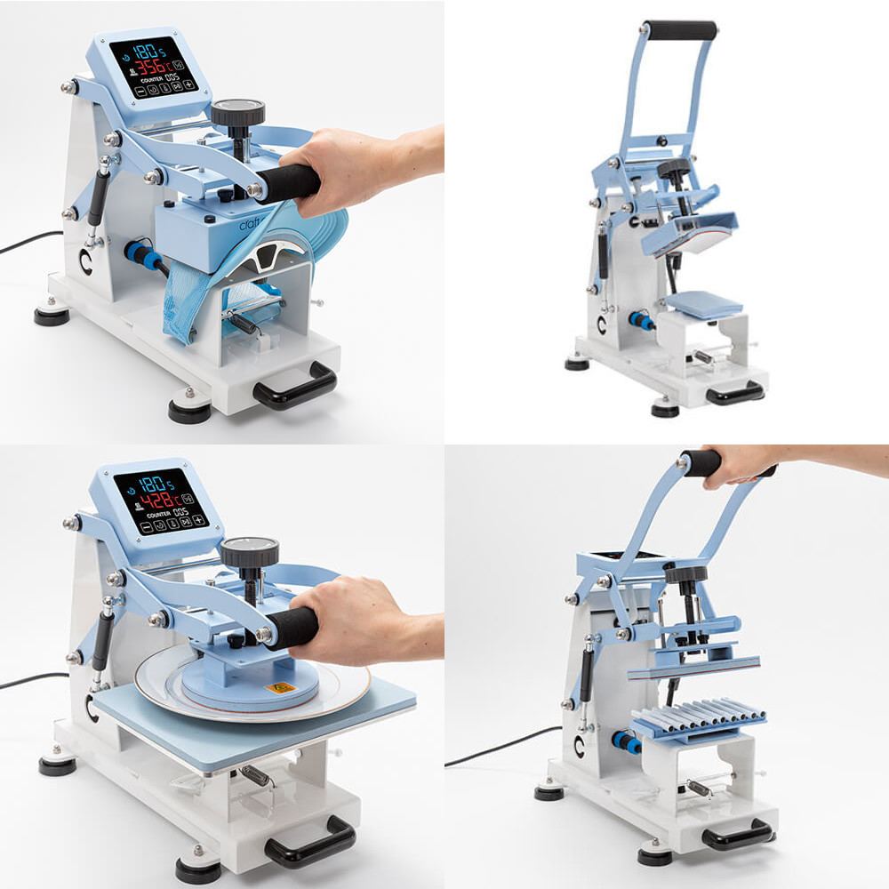 Praktikus megoldás sík tárgyak, bögrék, flaskák, baseball sapkák, tollak, tányérok és sípcsont védők szublimációs hőkezelésére egyetlen géppel.
