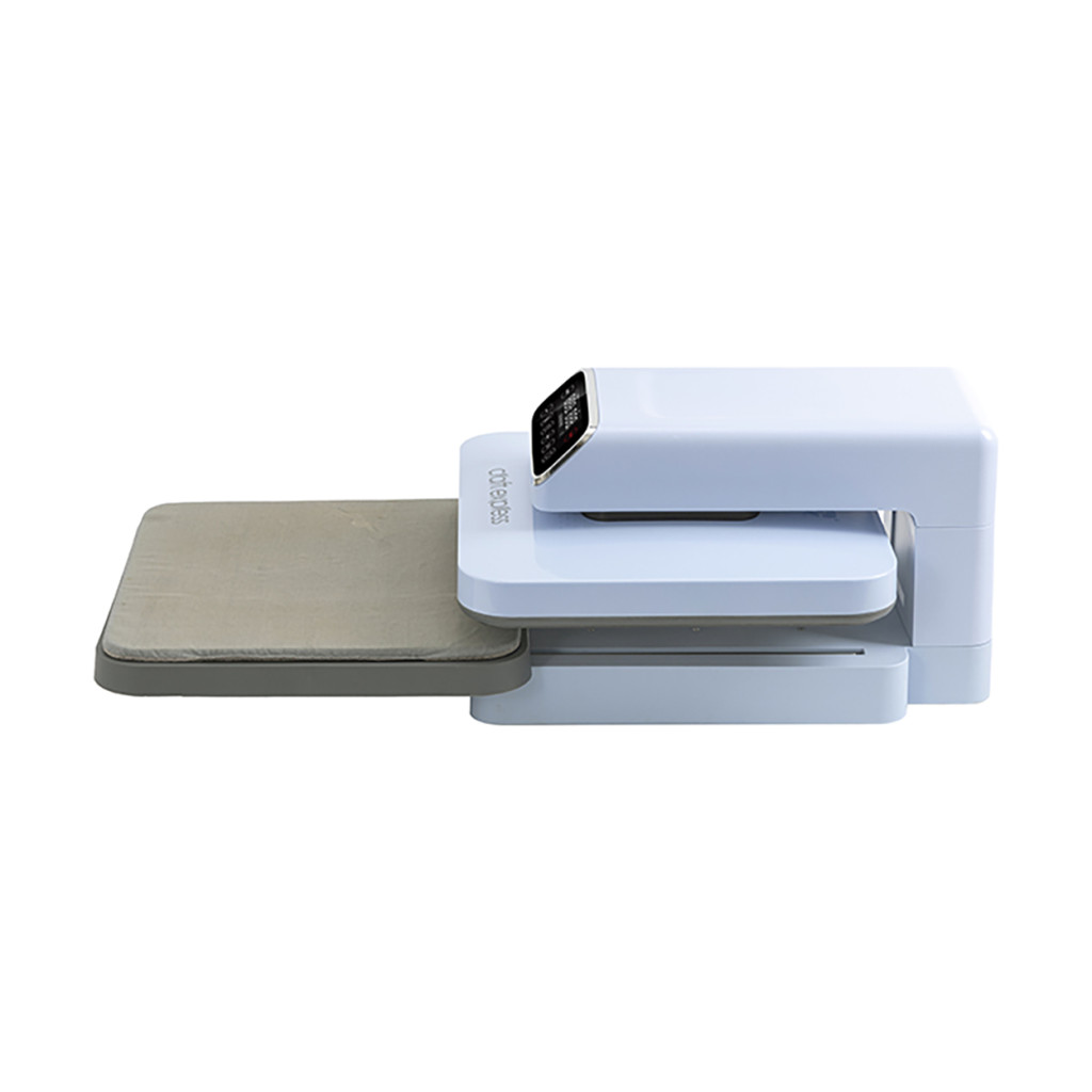 A kihúzható alsó tálcának köszönhetően a hőprés munkavédelmi szempontból kiemelkedően biztonságos: könnyedén elhelyezheted a nyomtatandó ruhadarabot a tálcán anélkül, hogy a folyamat során megégetnéd a kezed a felső fűtőfelüelttel. A vezetősínes kialakítás növeli a munkafolyamat hatékonyságát könnyű mozgatást biztosítva. A fogantyú nélküli kialakítás helyet takarít meg, és elegánsabb, kompaktabb megjelenést kölcsönöz.