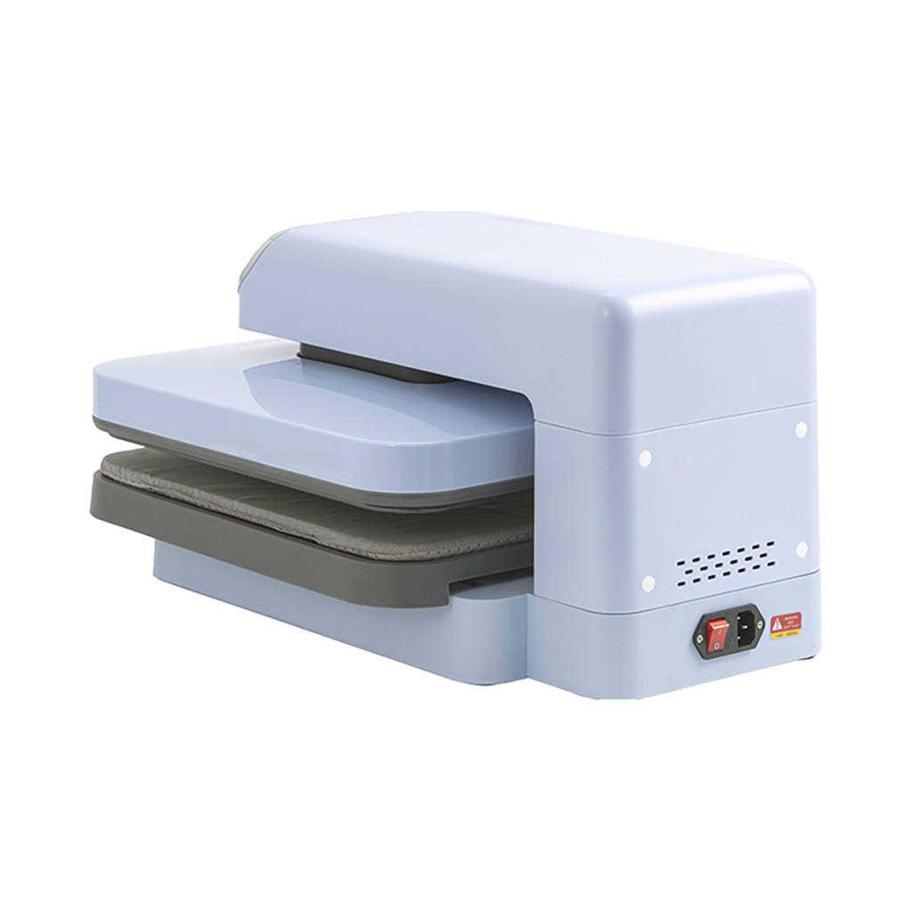 Sík hőprés 38x38 cm-es fűtőfelülettel, kicsúsztatható alsó tálcával és automata nyomáserő állítással textil termékek vagy sík tárgyak vasalásához.