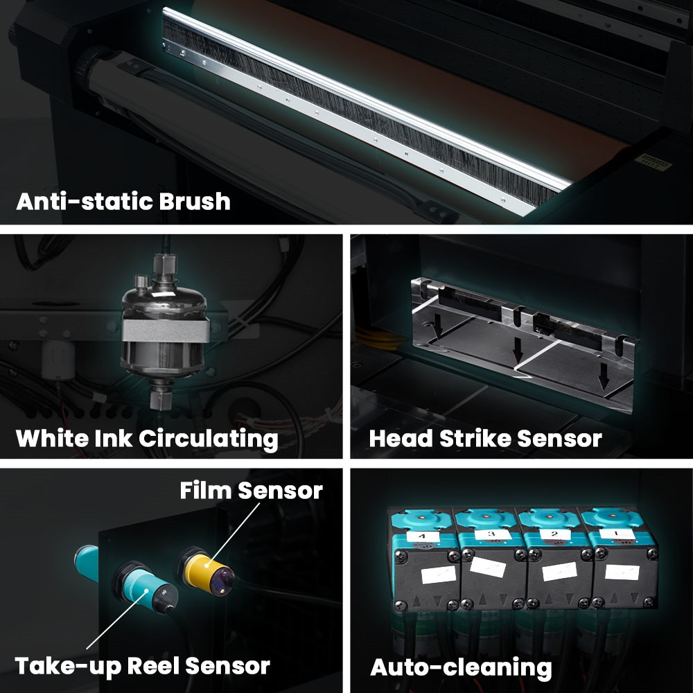• Komplett induló kellékszett: UV DTF festékszett, UV DTF A+B fólia, tisztító- és karbantartó folyadék