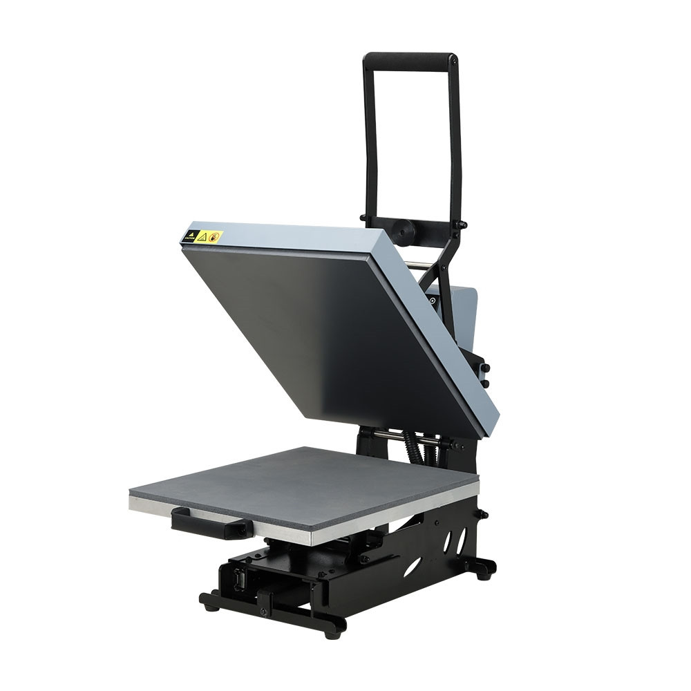 A kihúzható alsó tálcának köszönhetően a hőprés munkavédelmi szempontból kiemelkedően biztonságos: könnyedén elhelyezheted a nyomtatandó ruhadarabot a tálcán anélkül, hogy a folyamat során megégetnéd a kezed a felső fűtőfelüelttel.