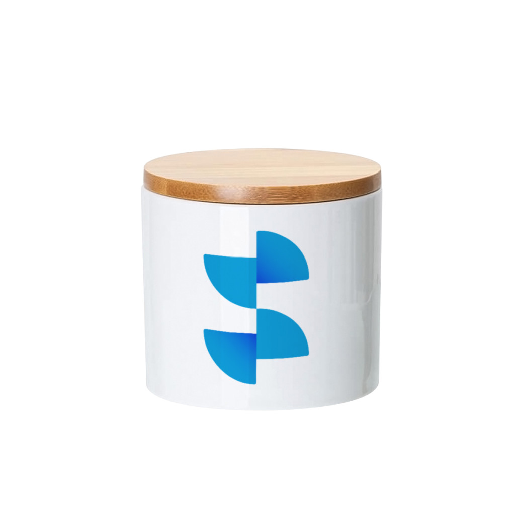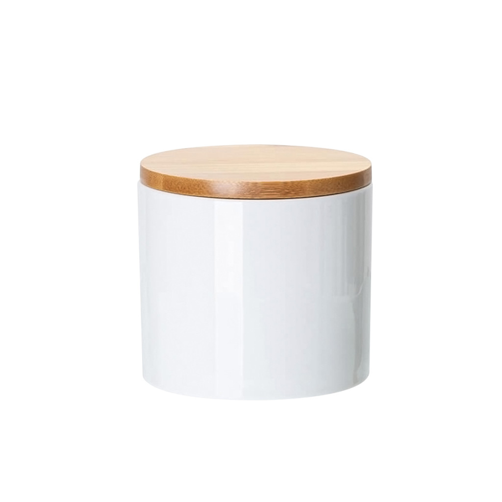 Printable ceramic storage jar with bamboo lid for sublimation transfer printing.