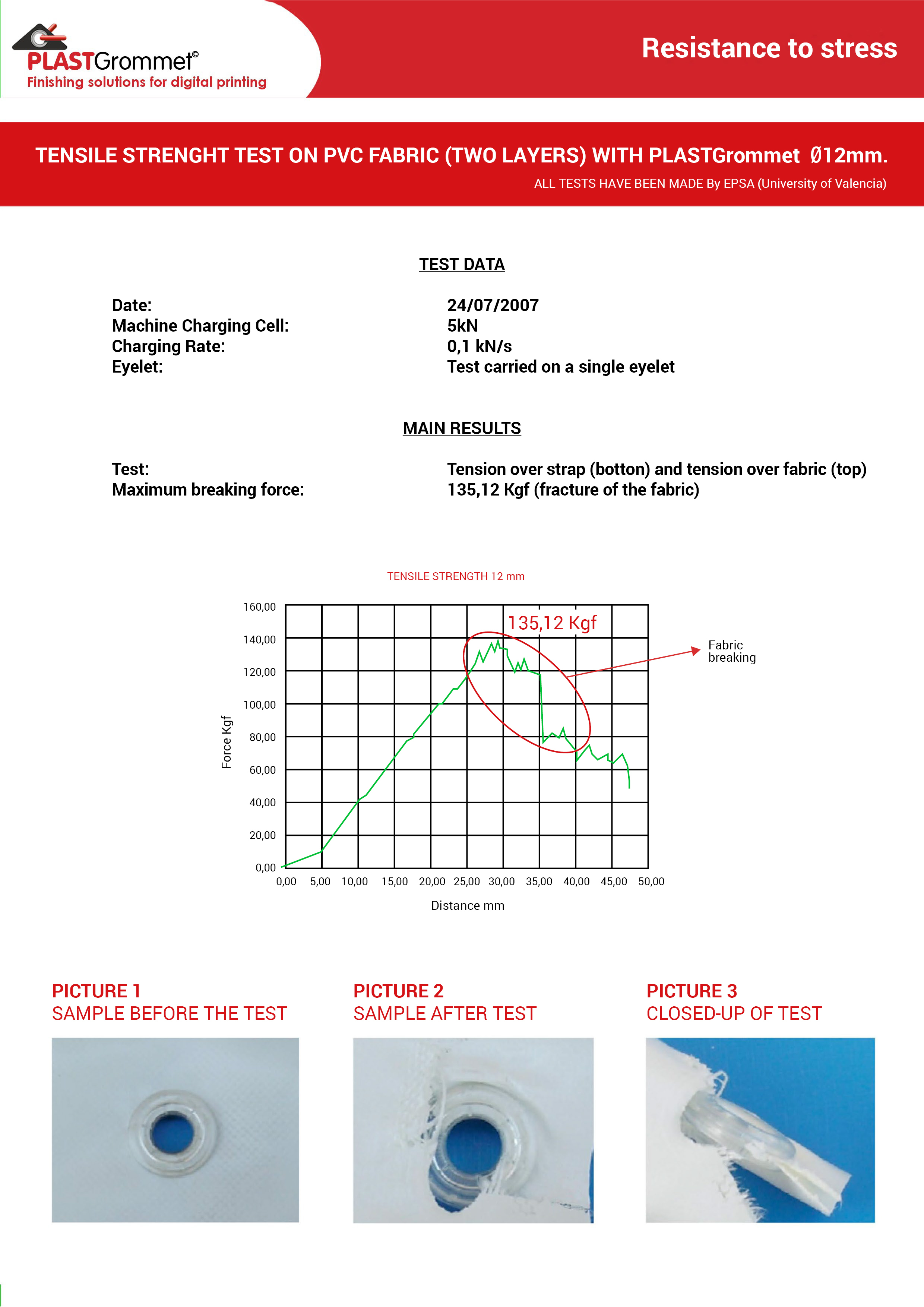 The Plastgrommet plastic eyelet is at least as strong and durable as the metal ones, but maybe even stronger! In the tensile strength test at the end of the article, you can see that a Plastgrommet plastic eyelet withstood a weight of 135 kg, but even then the tarpaulin tore, the ring remained intact! In addition, thanks to its special material, it is UV stable, so it will not be damaged by prolonged sunlight during the outdoor lifetime of your advertising material.