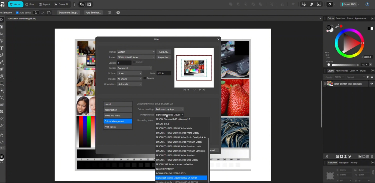 6. Select the color profile (eg. “Signdepot-InkTec L18050-L8050-v1-HARD”) in the second row (“Printer Profile”) of the column appearing on the right.