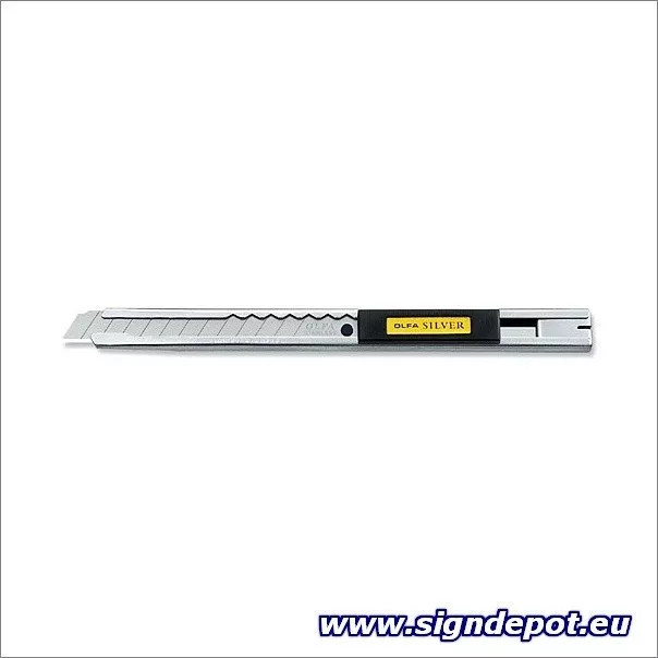 Model OLFA, znan kot Silver, ima ohišje in rezilo iz nerjavečega jekla z žepno sponko in lomilcem rezila.