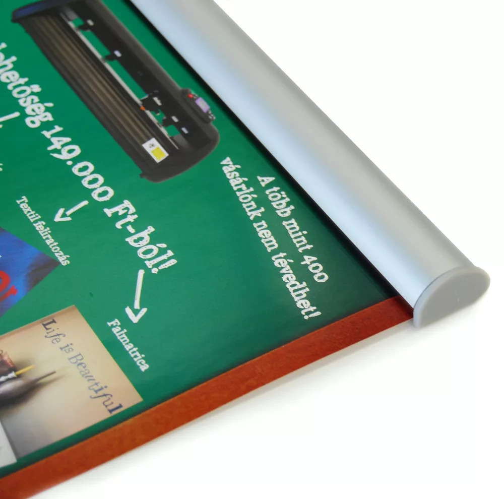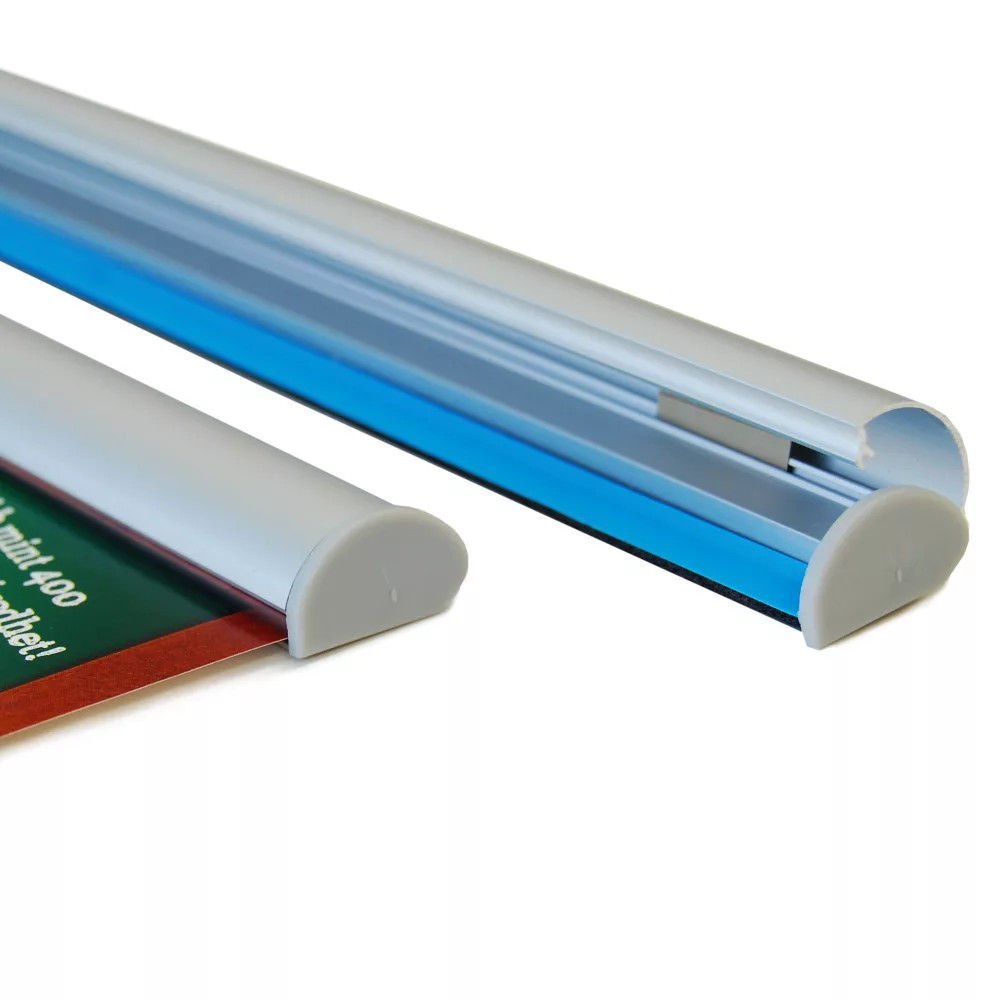 Kako prikazati svoj plakat? Risalni žebljički, samolepilni trak, ukrivljeni robovi... veliko lažje bo z našim Držalom za plakate! Uporabite rešitev po meri za prikaz vašega plakata na steni ali obešenega s stropa! Uporaba je zelo preprosta: samo odprite zgornji profil, vstavite vaš plakat in zaprite profil. Bolje kot drugi plastični ali aluminijasti profili za plakate, kjer je potrebno papir potisniti noter in lahko zmečka ter opraska vaš plakat. Držalo za plakate je narejeno iz visokokakovostnega eloksiranega aluminija, prihaja z dvema plastičnima koncema in lepljivim gumijastim trakom. Ta trak bo pomagal držati težke materiale, kot so veliki papirji ali plakatni transparenti.