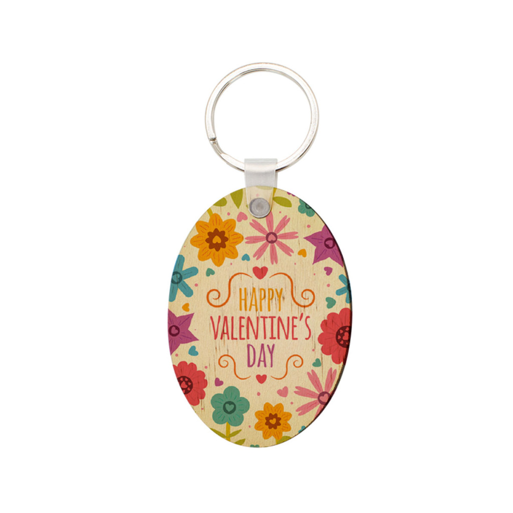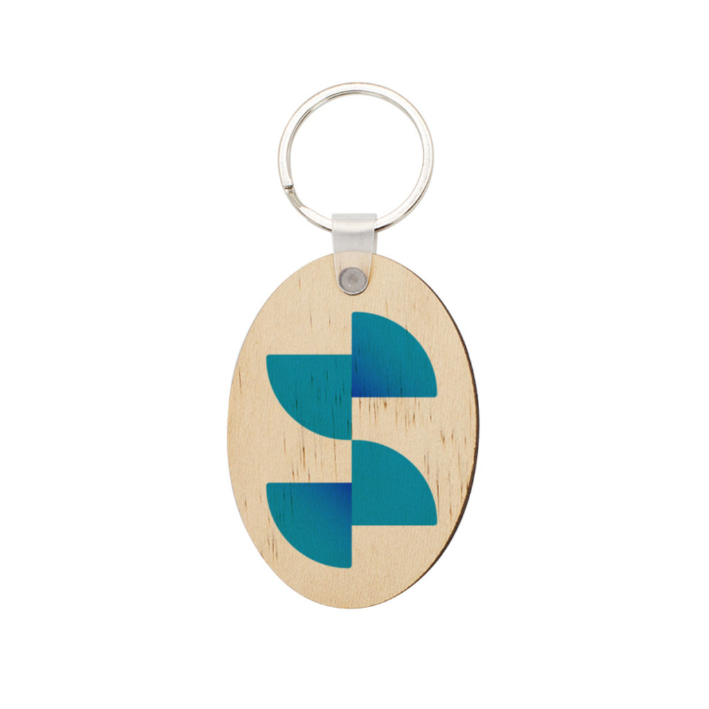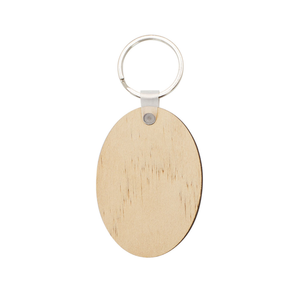 Szublimációs technikával nyomtatható ovális alakú fa kulcstartó.